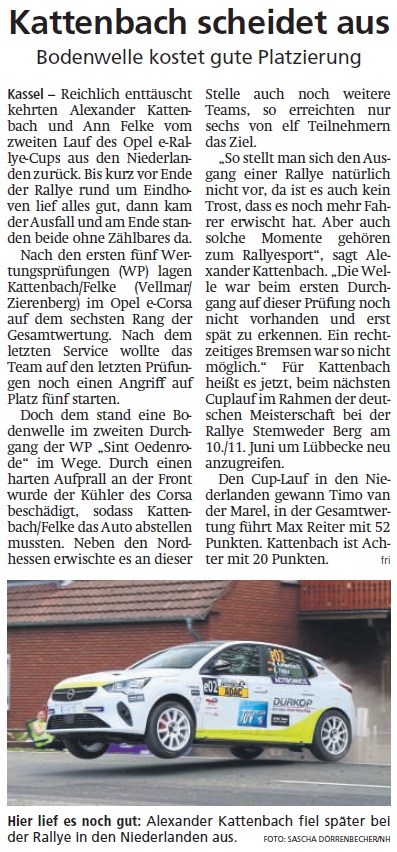 Alexander Kattenbach vom ADAC Ortsclub Fuldatal und Beifahrerin Ann Felke kämpften die komplette Rallye mit guten Zeiten im vorderen Feld des international besetzten ADAC Opel e-Rally Cup. Im Ziel erreichten die beiden den 4. Platz mit knappen 4,2 Sekunden Rückstand auf den 3. Platz.